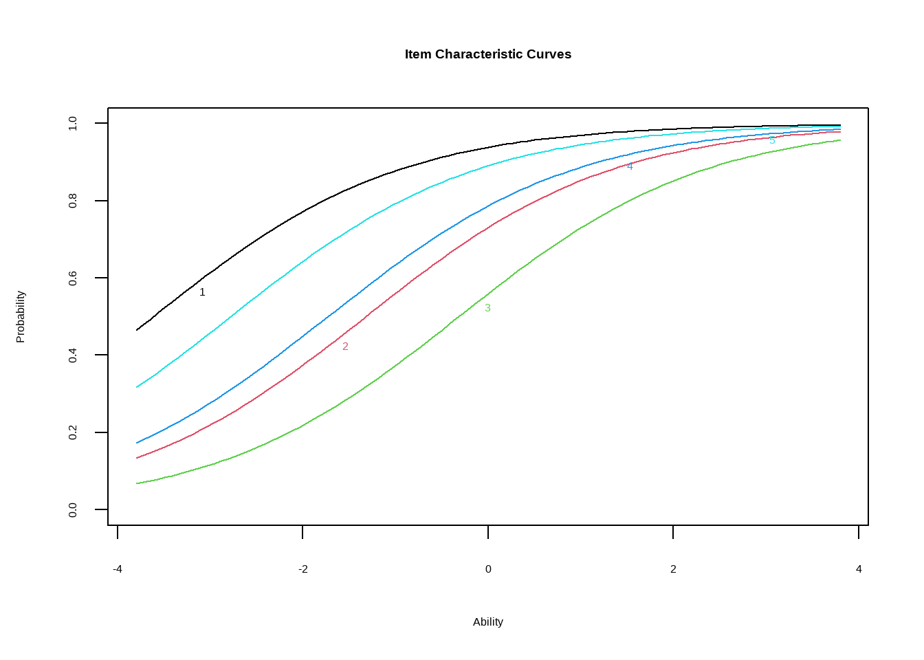 Визуализируем первую модель. Согласно оценённым параметрам, третий вопрос самый сложный - его кривая лежит правее прочих.