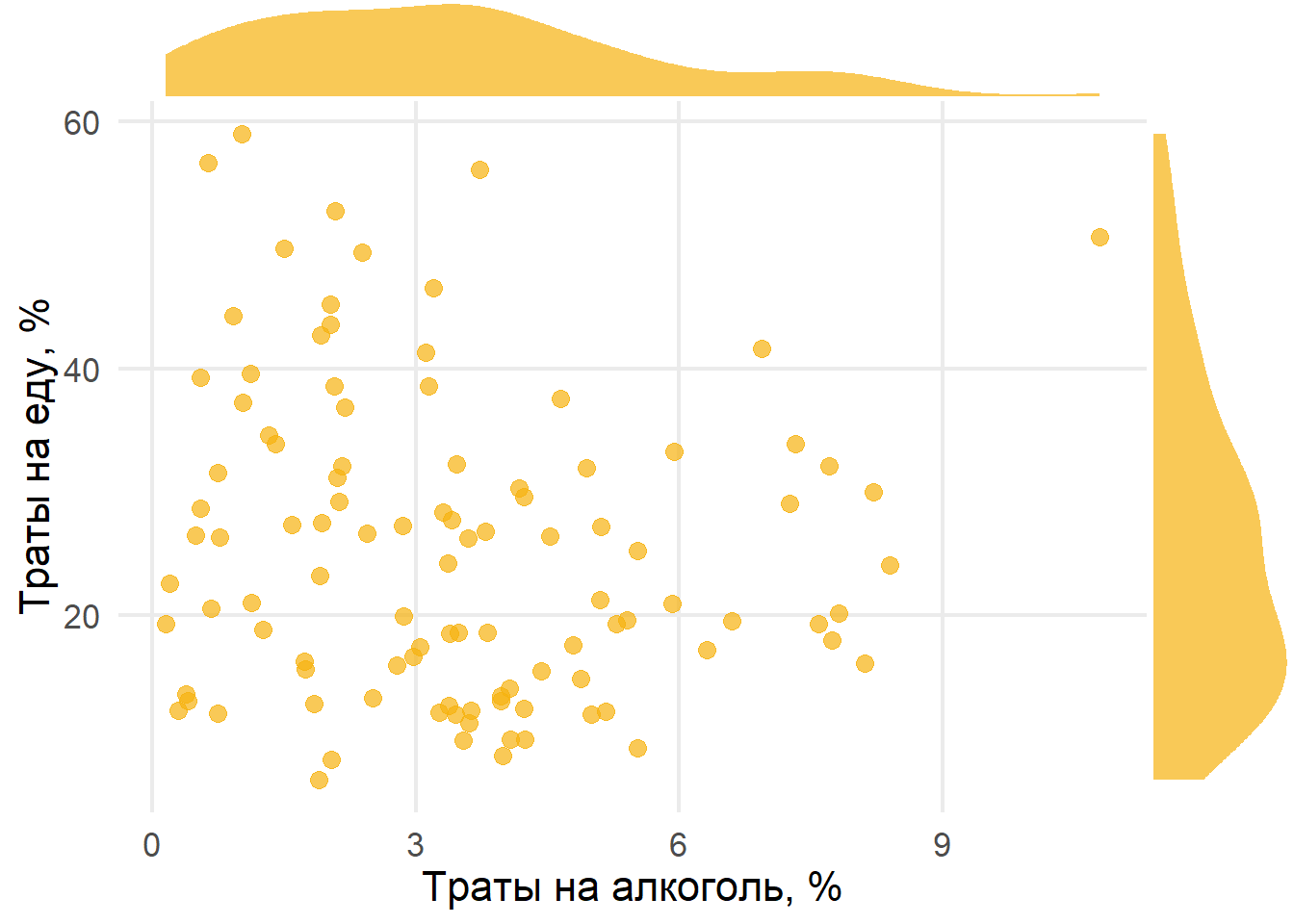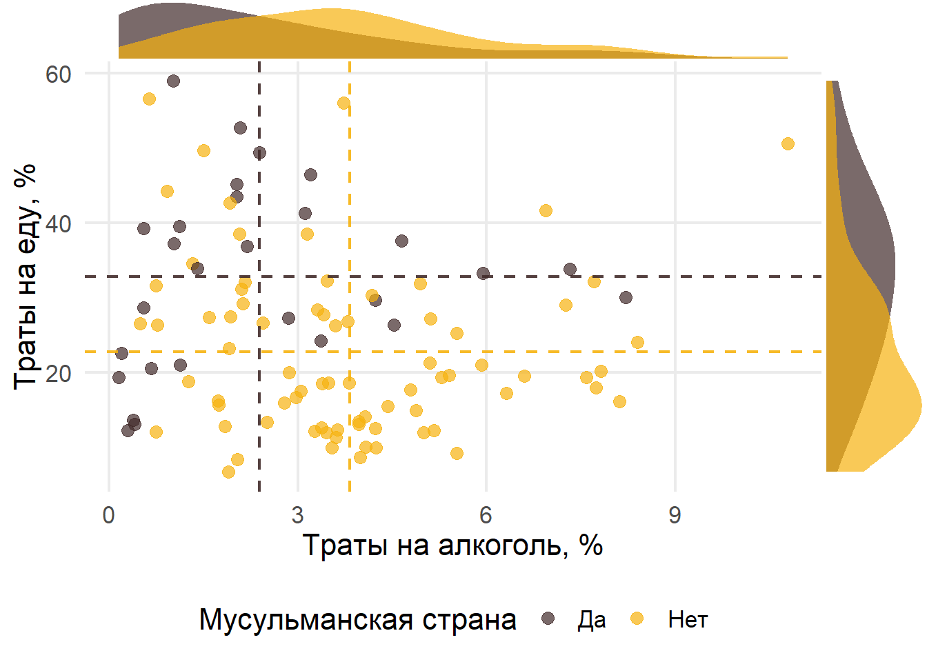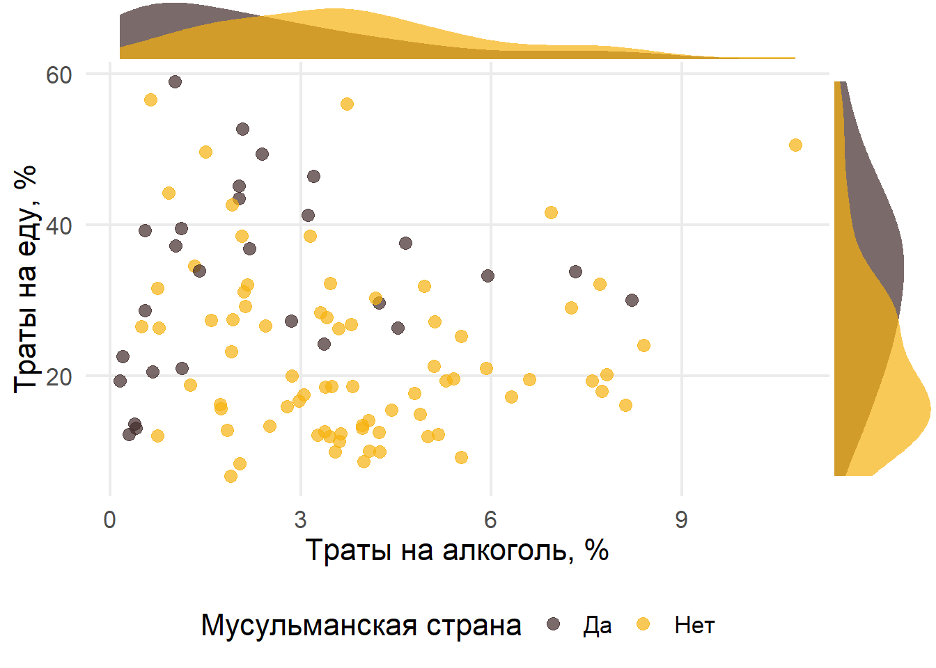ggplot(aes(x = `Траты на алкоголь, %`, y = `Траты на еду, %`, color = `Мусульманская страна`, fill = `Мусульманская страна`)) +